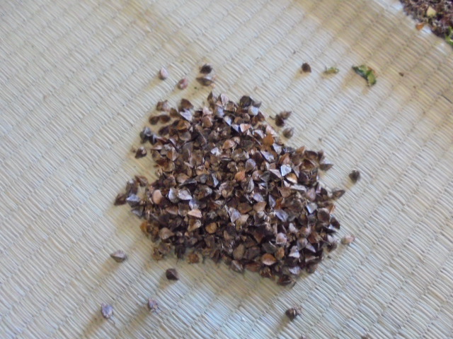 そして、これがそばの実です・・・たくさんあるように見えたけど、選別したらこんなに少なくなったんですね・・・でも、まだ”おそば”ではありません。この実を製粉(殻をとって中身をとる)してやっとそば粉になるんですね・・・そば粉は、そば職人さんが水を加え、こねて、こねて・・・切って・・・ゆでて・・・やっとやっとみなさんが大好きな?おそばになるんです。 でもおそばにはつゆも必要、薬味もほしいですよね・・・・話が飛びすぎ長くなりましたm(__)m・・・が、わたしたちのそばチャレンジは今回実の収穫までとしました。 でもいつか、”小菅ケ谷北公園のおそば”として味わいたいと思っています。そのときにはみなさんと一緒に種をまき・・育て・・収穫し・・そしてそばを打ち・・・頂けたらいいなぁと思っています。